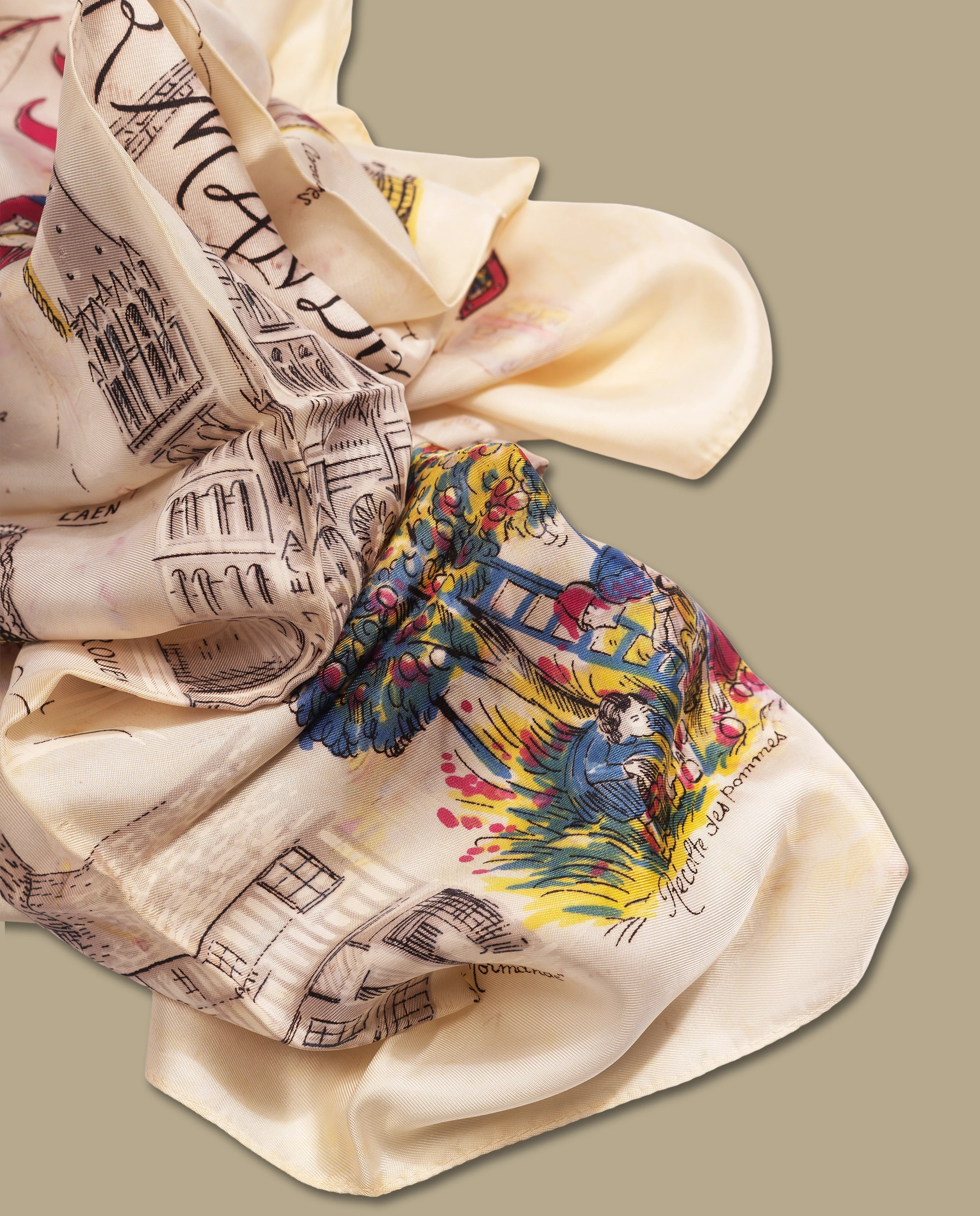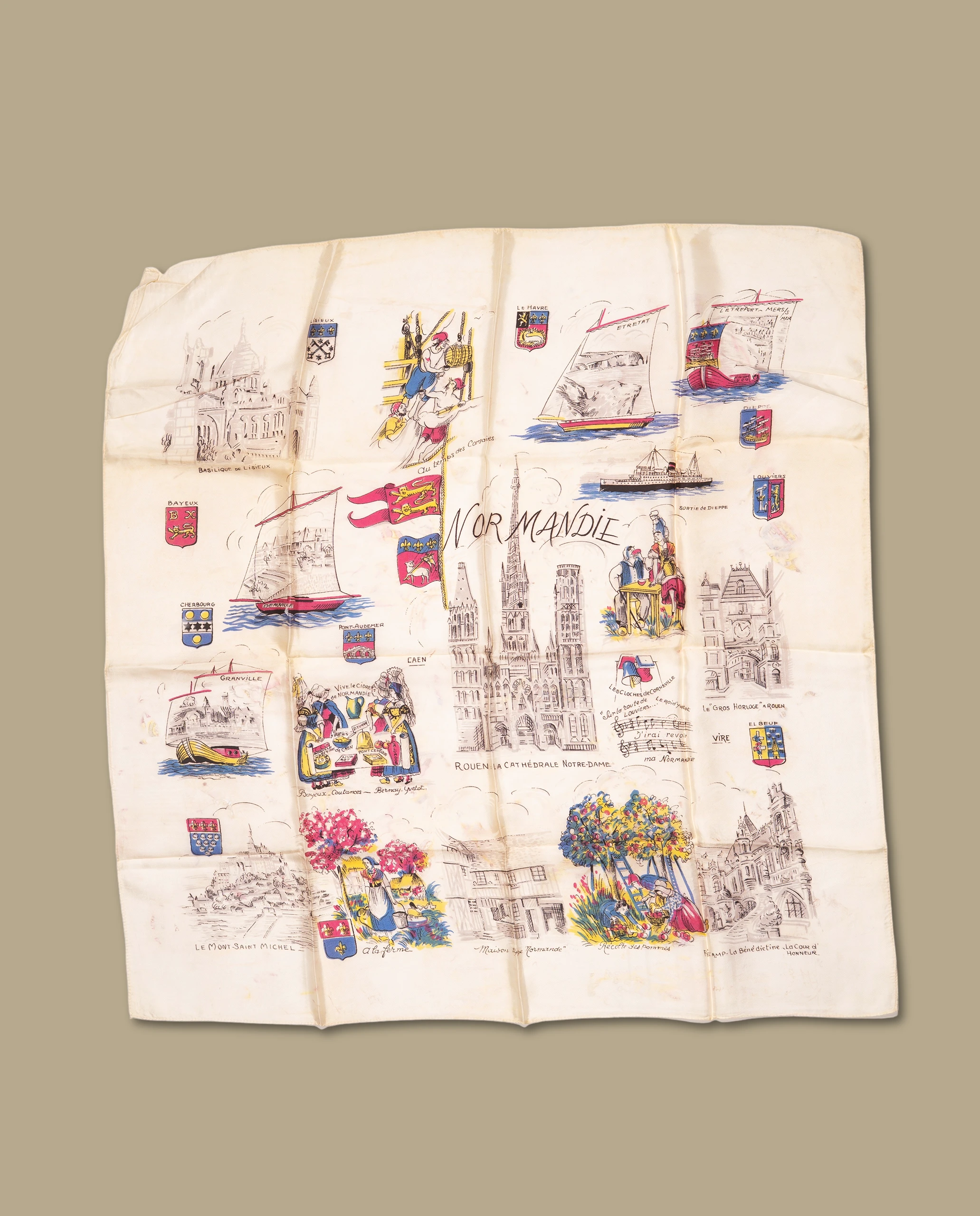 Foulard représentant des blasons de villes et lieux touristiques Normands : Etretat, Mont St Michel, Cherbourg, Le Havre….